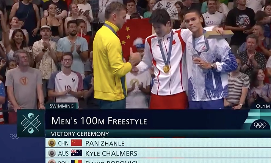 得到亚军的澳大利亚选手查尔莫斯先是用左手拍了一下潘展乐的后背,走近后伸出右手,却莫得看向潘展乐,似乎思要和得到铜牌的波波维奇捏手。