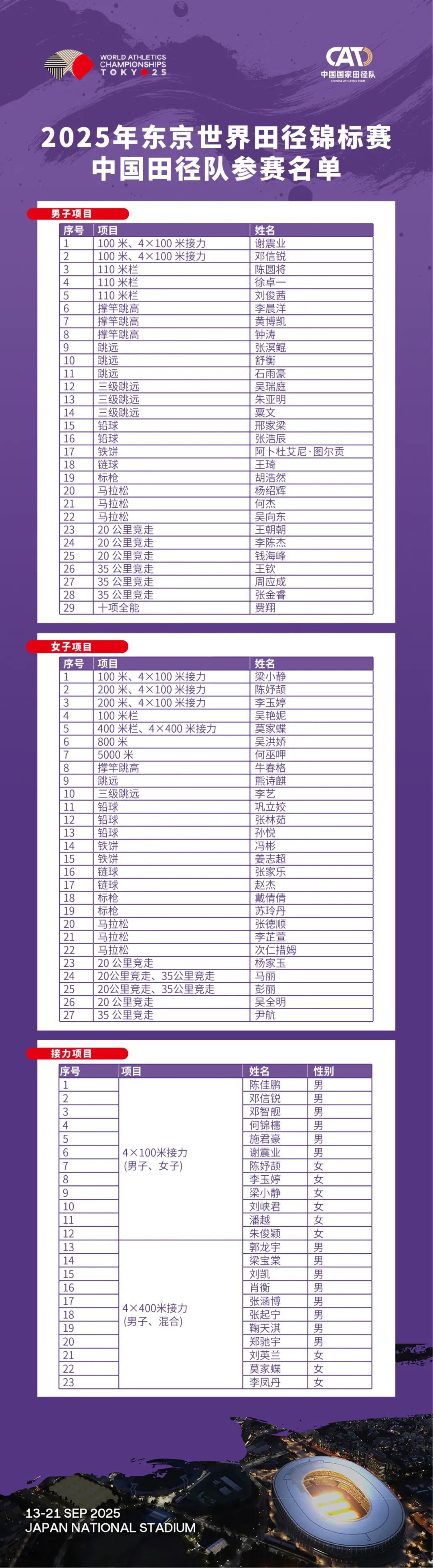 当拍浮、羽毛球等形态的顶尖嘉会接踵献艺之后,田径世界行将在9月迎来巅峰时刻。9月13日至21日,2025年世界田径锦标赛将在日本东京举行。北京时刻9月6日中午,中国田径队厚爱公布了参加本届世锦赛的通顺员名单,73东说念主(男通顺员41名,女通顺员32名)的参赛声势将参加沿途49个形态中33个形态的争夺,巩立姣、杨家玉、冯彬等奥运会、世锦赛冠军所有在列。